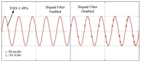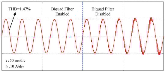 Figure 15, Figure 16 and Figure 17 show the Grid-tied current waveform before and after the control switch with 2 mH, 4 mH and 6 mH. The THD of the three cases is 1.52%, 1.47%, and 1.49%, respectively. From the THD value, it can be seen that the value of THD is lower than the international standard, so the BF method can reduce the adverse impact of power grid impedance to a certain extent. At the same time, it could be known that when the BF is enabled, the waveform of the grid current is smooth, and when the BF is disabled, the current waveform rapidly oscillates and becomes unstable. This verifies that the proposed control strategy is still valid even in the weak power grids.