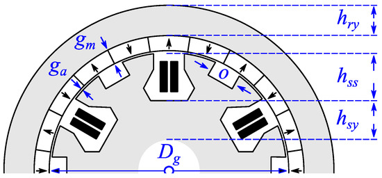 Flux modulation machines (FMMs) owing to the flux modulation effects have higher torque densities and thus FMMs are naturally suitable for direct-drive applications [5,6,7,8,9,10,11,12,13,14,15]. Among the family of FMMs, the surface PM (SPM) vernier machine is famous due to its higher torque density, higher torque quality and simple mechanical structure [5,6]. Aside from the advantages, the low power factor of the SPM vernier machine, getting significantly lower especially at higher power ratings (MW scale), remains a challenge and there are some serious concerns including magnetic saturation and PM demagnetization [11,13].