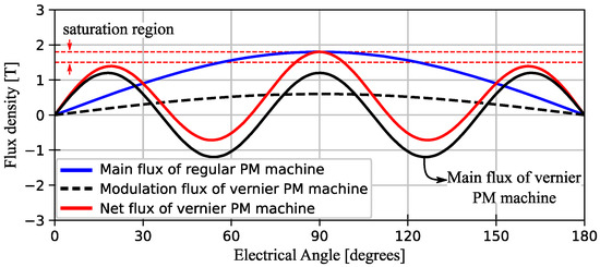 In machine design, the maximum tooth flux density is commonly set as 1.8T, but it should be noted that the flux density Bteeth of (15) is composed of two fluxes with different wavelengths. To demonstrate the peculiar nature of vernier machine, the conceptual flux density waveforms of regular PM machine with Zr pole pairs and vernier PM machine with 5Zr pole pairs is shown in Figure 2. If the saturation of iron core is assumed to begin from 1.5T and if both the machines are designed to obtain 1.8T of the tooth flux density, the saturated core area of vernier PM machine is comparatively much smaller than that of the conventional PM machine as depicted in Figure 2. Therefore, when using (15), the flux density can be higher than 1.8 for design of the vernier PM machine.
