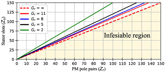 In the following section, various performances of SPMVG will be discussed, and it will be shown that the performances are sensitive to certain design parameters. Thus, to effectively utilize the advantages of SPMVG, the proper selection of various design parameters is important. First, in order to demonstrate an important aspect of the design problem, the graph of the gear ratio with variation of the PM pole pairs Zr and the total stator slots Zs is shown in Figure 3. Under the condition of balanced 3-phase stator winding configuration, it is possible to operate everywhere on the graph except the infeasible region shown in Figure 3. Now, it is to be decided which slot–pole combination should be selected among the various slot–pole combinations with different gear ratios and modulation pole pairs.