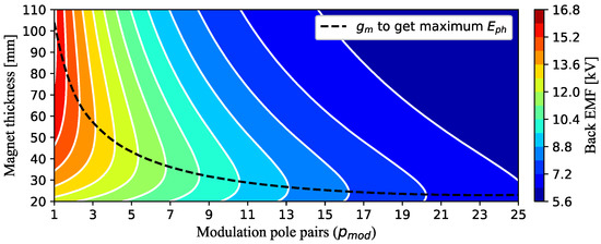 The back EMF performance of SPMVG is very sensitive to certain design parameters such as the slot opening ratio c0, slot–pole combination, and the PM thickness gm. To show the back EMF trends, a gear ratio of 11, rated speed of 7.56 rpm, slot opening ratio c0 of 0.55, air-gap diameter and stack length of the reference model (see Table 1) is used. By using those basic design parameters, the back EMF of SPMVG with variation of PM thickness and modulation pole pairs is shown in Figure 4. First, it can be noted that the magnitude of the back EMF is higher when is lower, and back EMF starts decreasing as increases. Moreover, for each there exists a specific PM thickness called the optimal PM thickness that produces the maximum back EMF as shown by the black dotted line in Figure 4, and it should be noted that as the increases, the optimal PM thickness starts decreasing.