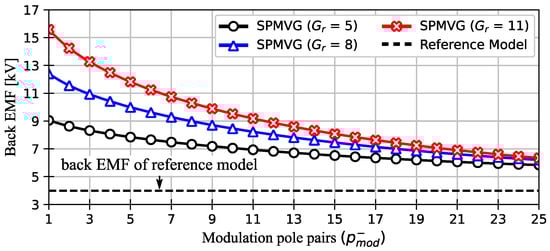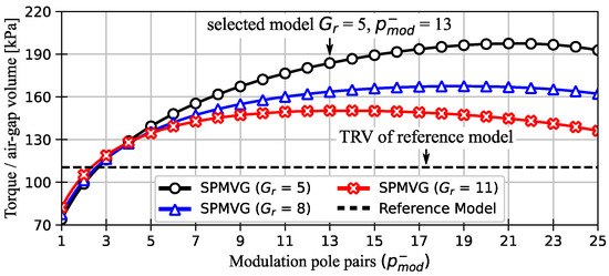 The torque per air-gap volume commonly known as TRV is calculated by using (9) as shown in Figure 8; the TRV of the reference model is also depicted on the graph. It can be noted that each gear ratio and its modulation pole pairs depending on the available surface current density Ks, offer a certain TRV, and as the modulation pole pairs change, the available TRV changes significantly. As compared to the TRV of the reference model, that is, 110.38 kPa, the SPMVG with Gr = 5 and offers up to 80% higher TRV that is quite significant. As shown in Figure 8, it should be noted that at lower number of higher gear ratios, despite their lower Ks, provide comparatively higher TRVs, but as starts increasing, lower gear ratio has a clear advantage of having higher TRV. Furthermore, as shown in Figure 8, it can be noted that at higher number of modulation pole pairs, especially for higher gear ratios, the TRV starts decreasing despite having higher available Ks. In fact, it is due to the fact that at higher number of the PM-PM leakage flux is significant, and so is the decaying back EMF due to lower magnitude of Fm1 and P1.