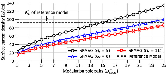 Unlike the problem of magnetic saturation in the back yoke, the flux density in the tooth region is tricky to control because the available tooth region is limited due to the fixed stator slot opening ratio c0. When the optimal magnet thickness obtained in the previous section is used for a given slot–pole combination, the only adjustable variable for Bteeth of (15) is the surface flux density Ks. Therefore, it is necessary to determine the proper Ks to keep the value of Bteeth in order to avoid the saturation problem. Considering that Bteeth of a vernier machine can be higher than that of a conventional one, it is set to 1.8/0.95 = 1.92 T in this study. Thus, the available surface current density Ks that ensures the constraint of Bteeth = 1.92 T for each gear ratio and its are obtained and shown in Figure 6. It can be noted that the available Ks is somewhat inversely proportional to Gr and is almost proportional to . In addition, the results in Figure 6 clearly explain why it is not proper to take commonly used Ks value of the reference model, and notes that Ks for SPMVG can be much smaller depending on its slot–pole combination.