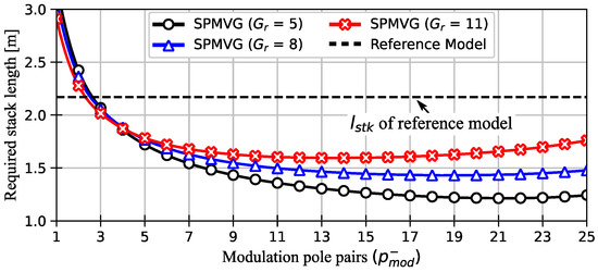 As the SPMVG has to be designed for a rated power of 15 MW, the rated speed, air-gap diameter, air-gap length, number of turns and volume current density of SPMVG are set the same as those of the reference model (see Table 1). Under those design constraints, by using the calculated available surface current density for SPMVG, the required stack length lstk for rated power of 15 MW is calculated as shown in Figure 7. It can be noted that for the same rated power, as the number of modulation pole pairs increases, the required stack length of SPMVG first decreases, and at higher number of it starts increasing, regardless of the higher Ks. Moreover, it can be seen that the lower gear ratio offers more advantage in terms of lower lstk due to the fact that the available Ks increases as the gear ratios decreases. The stack length of the reference model is also depicted in Figure 7. It can be noted that for the same rated power, SPMVG, depending on the gear ratio and number of modulation pole pairs, mostly offers much lower stack length that that of the reference model.