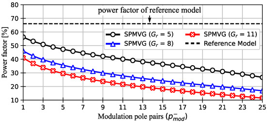 As discussed before, the available surface current density has direct and the back EMF has inverse relation with the modulation pole pairs thus, from (16) it is obvious that the power factor will decreases as the will increase. The calculated power factor of SPMVG for the three gear ratios and their is shown in Figure 9; it can be seen that the power factor starts decreasing as the increases, and of course the power factor is inversely related with the gear ratio. Moreover, it can be noted that the power factor of the SPMVG is much lower in comparison with the reference model. It is interesting to note that, considering the power factor, it is better to use lower that is a conflicting problem with the TRV.