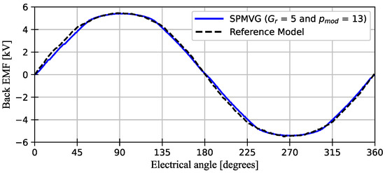 At rated speed of 7.56 rpm, by using (7), the back EMF performance of SPMVG at the optimal PM thickness for the three gear ratios () and their is obtained as shown in Figure 5; for comparison, the back EMF of the reference model is also depicted in the graph. First it should be noted that with the same air-gap geometry, the back EMF of SPMVG with each gear ratio and its is significantly higher than that of the reference model; obviously, it is due to the additional advantages of the flux modulation effects. Moreover, the back EMF trends suggest that higher gear ratio with lower offers the higher back EMF. For a given gear ratio, as the increases, the optimal PM thickness thins; as a result, the magnitude of Fm1 starts decreasing, and the leak factor kleak starts increasing, due to which the back EMF decreases as it is given by (7).