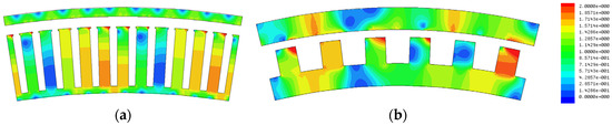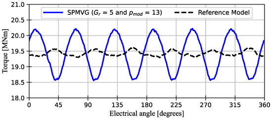 At the rated load conditions, the flux density distribution in the cores of the SPMVG and the reference model are shown in Figure 12. It shows that the SPMVGs do not have severe saturation spots, which means the machine is properly designed. Furthermore, for both the prototypes, considering their surface current densities, the corresponding rated current is applied in phase with the back EMF, the resulting torque waveforms are shown in Figure 13, and the percent torque ripple that represents the ratio of peak–peak torque to average torque is calculated for both the prototype models, and the values are given in Table 2.