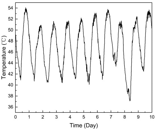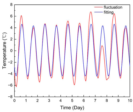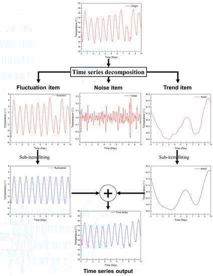 - Smooth the temperature time series X through the Savitzky–Golay filter Equation (19), and the difference between the results obtained and the temperature time series is the noise item R, which does not influence the trend item and the fluctuation item.