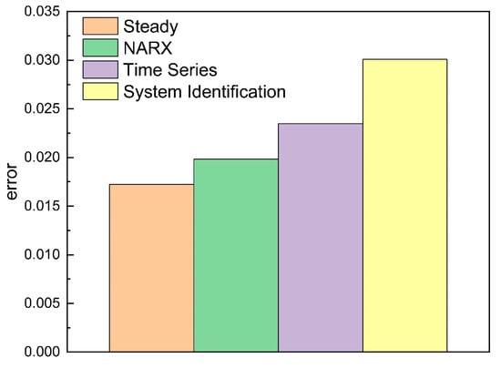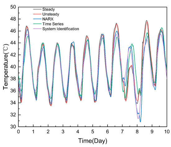 - The time calculations of the data-driven models were 4.0382 s, 1.67 s, and 1.683 s, which were faster than that of the first principle model. Among them, the total time of time series decomposition and system identification were almost consistent. The NARX neural network and system identification models need to obtain the applicable model through the analysis of historical data. The time to establish the model was relatively long, while the time series decomposition model was calculated directly, which was shorter than the NARX neural network.