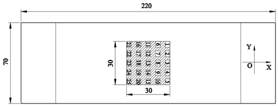 The specimens were cut from a 3 mm plate of ferromagnetic Q195 low-carbon steel and annealed to reduce the residual stress by heating them at 650 °C for 2 h and then allowing them to cool naturally in the furnace. The dimensions of the specimens are shown in Figure 2. The surface magnetic signals were detected using an array probe in the middle of the specimen, occupying an area of 30 mm × 30 mm. The X-axis is along the long axis of the specimen, and the Y-axis is perpendicular to the X-axis.