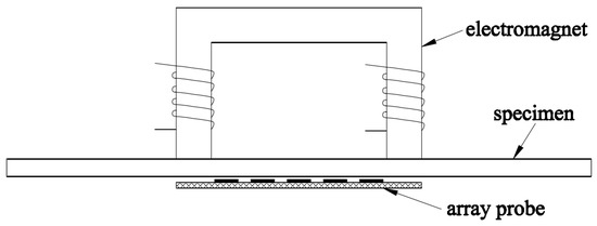 - During the magnetization process, the magnetic field and the normal component of surface magnetization of the plate specimen was measured online, by means of an array probe arranged on other side of the specimen and rotated around the poles of the U-shaped electro-magnet, as shown in Figure 4. The experimental setup is shown in Figure 5. Although the measured magnetization was not from inside of the specimen, it was proportional to the real magnetization value and could reflect the change of the real magnetization of the specimen [25].