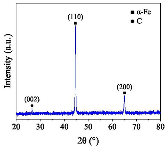 X-ray diffraction (XRD) was used to investigate the phase structures and purity of the prepared specimens. Figure 7 shows the XRD pattern of the prepared Q195 steel sheets. The XRD pattern confirmed the existence of α-Fe and C phases. Diffraction peaks can be observed at 44.58° and 64.88°, corresponding to the (110) and (200) planes of the α-Fe phase (PDF# 006-4192), with the diffraction peak at 26.75° corresponding to the (002) plane of the C phase (PDF# 014-0337). No other detectable peaks were observed in the, which indicates a low content of Mn, Si, S, and P in the specimen.