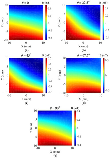 Figure 8 shows the distribution of surface magnetic induction B when the electromagnet poles were placed at θ = 0°, 22.5°, 45°, 67.5°, and 90° to the direction of stress for specimen 1 magnetized with a magnetic field of 3000 A/m. Data from the probes in the middle area of 20 mm × 20 mm were extracted because the field strength in this region is more uniform. Please note that the positive direction of the Y-axis is the direction of the external magnetic field H. The direction perpendicular to the zero contour is the direction of the surface magnetic induction B. Clearly, there was a difference in the directions between B and the magnetic field H at different angles. The direction of B was rotated with the increase in θ. Moreover, the amplitude of B reached a maximum of 0.6 mT at 45 °.