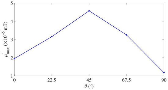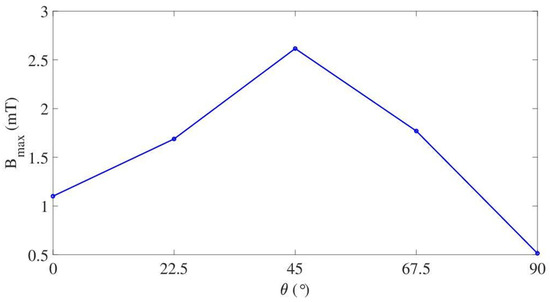 Figure 10 and Figure 11 show the effect of angle on the maximum differential permeability and the maximum magnetic induction for specimen 1. The behavior at small angles showed an increase in and , reaching a peak value at 45°, and then decreasing at higher angles. In addition, the values of and were smallest at 90°.