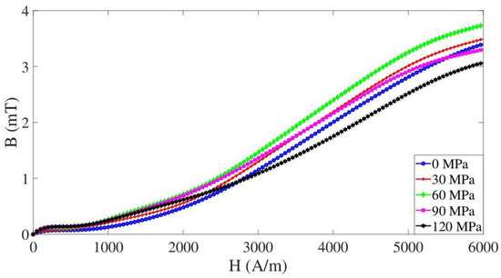 Figure 12 shows the magnetization curves for specimen 2 under different levels of stress at an angle between stress and magnetic field of 0°. Its behavior showed an increase in the slope of the magnetization curve with the increase in magnetic field H under stress, from 0 MPa to 60 MPa, and then a decrease at higher tensions. Thus, the derived magnetic induction B indicated a peak value of 3.74 mT at 60 MPa.