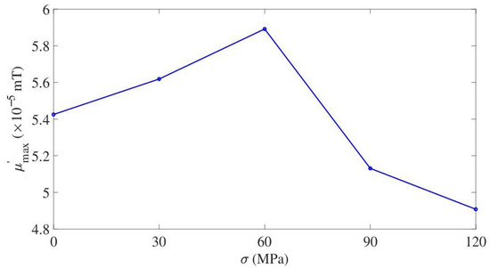Kaminski [6] published data showing the variation of magnetic properties with stress for angles of 0°, 22.5°, 45°, 67.5°, and 90°. Figure 16 shows plots of the effect of stress and angle on the maximum differential permeability in his article. The results provided by Kaminski in Figure 16 were similar to those seen in Figure 10 and Figure 13. Under a stress of 80 MPa, the maximum differential permeability reached a peak value at 45°. Similarly, under an angle of 0°, the maximum differential permeability first increased with the increasing stress and then decreased with increasing stress, reaching a peak value at 70 MPa, which is consistent with the test results. However, the maximum differential permeability value at 120 MPa was greater than 0 MPa, which is inconsistent with the test results.