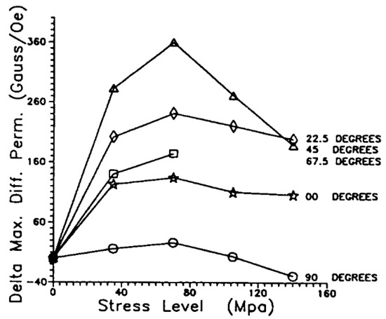 Maximum differential permeability relative to the stress at different angles for a specimen of polycrystalline iron containing 0.1 wt% C. Adapted with permission from Ref. [6]. Copyright 1992 Elsevier Science.