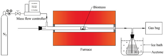 The torrefaction experiment was conducted in a fixed-bed reactor, as shown in Figure 1. It was mainly composed of a carrier gas N2 supply system, a quartz tube fixed-bed reactor heated by an electric furnace, a condensation system, and a gas bag for product gas collection. The condensation system was made of an acetone washing bottle immersed in an ice-bath. For each experiment, the furnace was heated to reaction temperature and kept constant in advance. The whole experimental system was connected as per Figure 1. Around 0.5 g of Paulownia wood sample was accurately weighed (12 mm of wood was a single particle), and it was put into a ceramic boat and placed in the low temperature zone of the reactor tube inlet. N2 gas was opened to purge the system for 30 min at a flow rate of 20 mL/min to remove all the air in the system. The boat was then promptly pushed into the middle of the reactor with a pushing rod, and the experiment started. A 3 L gas bag made from aluminum foil was connected to collect the product gas.