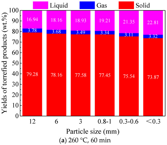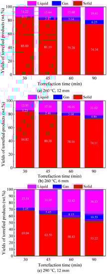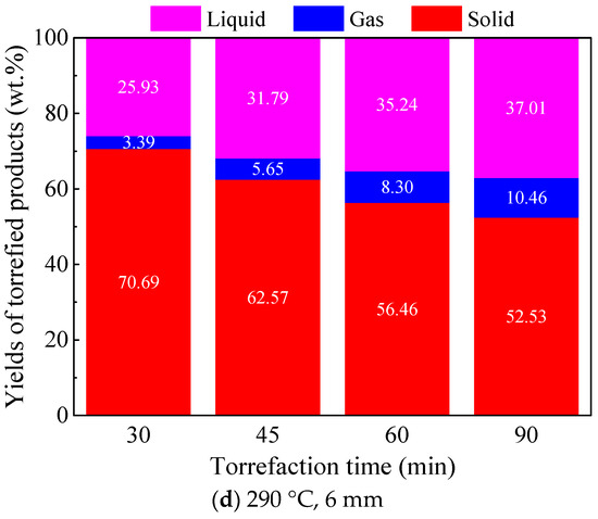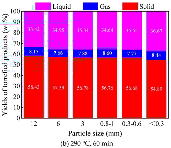 With respect to torrefaction temperature, the increase in torrefaction temperature greatly decreased the yield of solid torrefied wood, while it increased the yields of the liquid and gas products significantly. The same trends were found for different particle size biomasses. With the same torrefaction time, the increase in temperature obviously increased the torrefaction degree of the biomass samples. This is mainly due to the enhanced thermal decomposition reactions at higher temperatures. Comparatively, a higher torrefaction temperature would reduce the influence of particle size on the yields of torrefied products. For instance, when torrefied at 260 °C for 60 min, with a decrease in particle size from 12 to <0.3 mm, the yield of the solid torrefied wood decreased by 5.41 wt.%, and the yield of the liquid product increased by 5.87 wt.%; moreover, when torrefied at 290 °C for 60 min, with the decrease in particle size from 12 to <0.3 mm, the yield of solid the torrefied wood decreased by 3.55 wt.%, and the yield of the liquid product increased by 3.25 wt.%.
