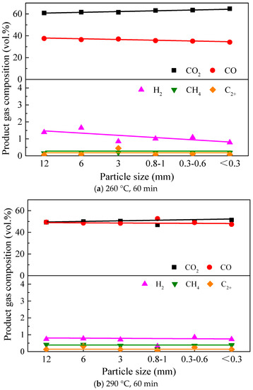 Figure 3 shows the product gas composition from the torrefaction of Paulownia wood with six different particle sizes at 260 and 290 °C for 60 min. It can be observed that CO2 and CO were the main gases generated from the torrefaction of Paulownia wood; these two occupied more than 98 vol.% of the product gas. Since the torrefied liquid products were mainly water and small molecular carboxylic acid and ketones [27,28], this further verified the deoxygenation effect of torrefaction on biomass samples as being quite significant, and the main reactions included dehydration, decarboxylation, decarbonylation reactions, etc. [29], which removed the oxygen in biomass in the forms of CO, CO2, H2O and carboxylic acid. From the perspective of changes in the product gas composition, it can be seen from Figure 3 that the effect of particle size on the torrefied gas composition was insignificant, which was consistent with the result in Figure 2 that no obvious change was found in its mass yield. When torrefied at 260 °C for 60 min, the CO2 content in the product gas (more than 60 vol.%) was higher than that of CO, which indicated that the decarboxylation reaction (generating CO2) was more than the decarbonylation reaction (generating CO) when Paulownia wood was torrefied at a relatively low temperature. With the decrease in particle size, the CO2 content increased slightly, the CO content decreased slightly, the H2 content also decreased slightly, while the contents of CH4 and C2+ (generated from the cleavage of branch chains C-C/C-O) were always very low. When torrefaction temperature rose to 290 °C, the composition of the product gas, especially the contents of CO and CO2, changed greatly compared with those torrefied at 260 °C; the contents of CO and CO2 were both close to 50 vol.%, and the CO2 content was slightly higher generally. The effect of particle size on gas composition at 290 °C showed similar trend with that at 260 °C, as stated before. Considering that the yield of the product gas from torrefaction at 290 °C was much higher than that from torrefaction at 260 °C, the yield of each gas component increased, and, comparatively, the increase in CO yield was higher than that of the CO2 yield, indicating that the decarbonylation reaction was strengthened more at higher temperatures.