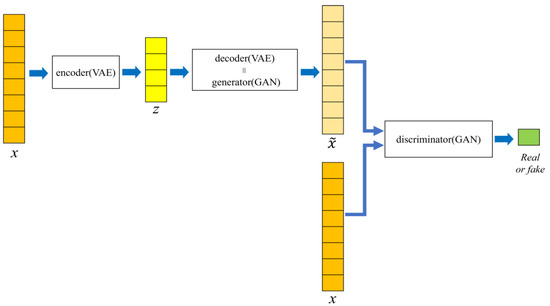 Although it is possible to obtain synthetic data from random noise without density functions using GAN, it may be advantageous to attain new samples from the generator with specific distributions under imbalance data. Then, a generative model is designed by assigning the decoder of VAE as the generator of GAN. Figure 1 depicts the structure of the VAE-GAN.