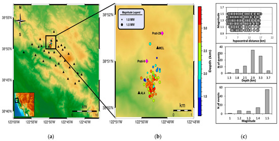 (a) Map view of the TG area. The black triangles mark the location of the network stations. The black square highlights the area of the selected events. In the bottom left panel, the black square identifies the overall TG area in California; (b) Zoomed-in view of panel (a) for the selected events. Every event is marked with a circle whose size scales with magnitude, while the colors follow depth information according to the color bar on the right. The pink diamonds specify the locations of Prati-9 and Prati-29 wells. The two closest stations are marked with black triangles; (c) Top: number of records as a function of hypocentral distance; middle: depth distribution; bottom: magnitude distribution.
