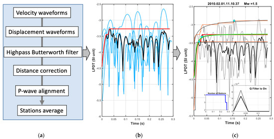 In order to obtain source parameters, LPDT curves are built for the events of the dataset. This approach shares the concept with the standard spectral analysis where signal spectra are processed to obtain corner frequency and a low asymptotic level which are related to source parameters. LPDT curves are built according to few steps which can be summarized in panel (a) of Figure 2. Firstly, velocity waveforms are integrated to obtain the displacement. To avoid the baseline effect, displacement waveforms are filtered with a high-pass cut-off frequency, fc = 0.5 Hz. Following the method by Zollo et al. [24], the LPDT curve at time t is evaluated as: