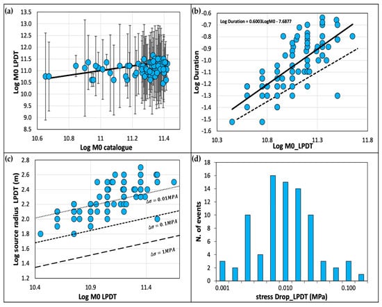 (a) Logarithm of seismic moments obtained from LPDT versus logarithm of seismic moments available from Kwiatek et al.’s refined catalogue. The solid black line represents the one-to-one relationship of catalogue M0. The errors are obtained by error propagation from Tc and PL; (b) Logarithm of duration (inferred by Tc of LPDT curves) versus logarithm of M0 from LPDT. The solid black line of best fit is represented with its equation written in the top left corner of the panel; the dashed line represents the theoretical line with a slope value of 0.5 (see also Figure 4c [24]); (c) Logarithm of source radius versus logarithm of M0 from LPDT. The data show a constant stress drop scaling with an average value of 0.01 MPa. Following different line styles, three different fixed values of constant stress drop are represented in the graph; (d) Stress release distribution obtained from LPDT. The mean stress release value is around 0.01 MPa.