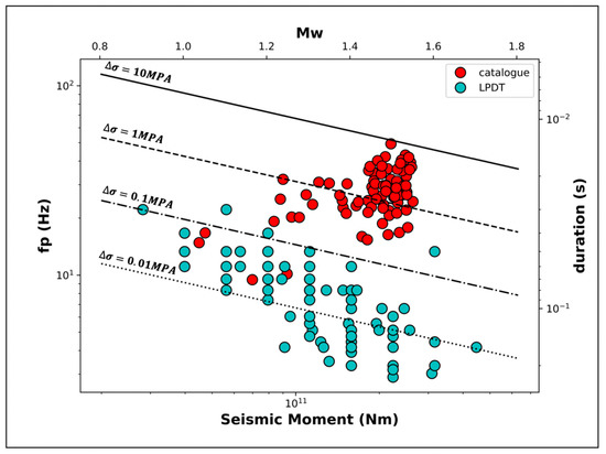 Representation of frequency and duration (left and right axis) versus moment magnitude and seismic moment (upper and lower axis). The cyan points are the parameters obtained with the LPDT method, while the red points are the parameters from the refined catalogue of Kwiatek et al. [27]. Different values of stress drop are shown on the graph. It is visible that data from the LPDT method follow a better constant stress drop scaling.