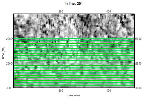 In order to analyze the accuracy of the DAF-U-Net network in identifying underground fractures in hot dry rocks, we compare our obtained results to the manual annotation label (Figure 9), refection attribute (Figure 10), and single diffraction attributes (Figure 11). Compared to the manual annotation result in Figure 9, the prediction result of the DAF-U-Net network is relatively accurate. In terms of overall characteristics, it conforms to the characteristics that the underground faults and fractures of the hot dry rock in the Gonghe basin are generally in the NW (northwest) and NNW (north–northwest) directions.