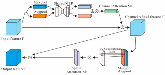 Attention mechanism. The CBAM (convolutional block attention module) contains two sub-modules—channel and spatial. The channel attention uses the maximum pooling and the average pooling to provide the features, and the MLP (multi-layer perception) combines them to finish the channel attention sub-module. The spatial attention sub-module uses the maximum pooling and the average pooling without MLP but puts them in the convolution layer to finish the spatial attention.