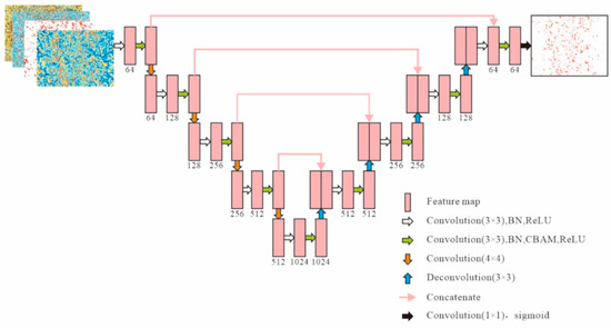 In the decoding path, the network model uses the deconvolution method to map the high-dimensional features to the low-dimensional features. That is, two convolutional layers with a convolutional kernel of 3 × 3 and a deconvolutional up-sampling operation with a size of 2 × 2 are utilized, which causes the number of feature maps to be halved and the scale to be doubled. In the convolution process, feature stitching is carried out using skip connection, so the deep learning accuracy is higher. The process can be expressed as follows: