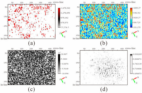 Diffraction attributes diagram of test slice. (a) The average energy attribute; (b) the instantaneous amplitude attribute; (c) the maximum positive curvature attribute; (d) the coherence attribute. Both (a,b) have better fracture performance in the northeastern region of the whole working area, while (c) describes the cracks in the working area as being mainly distributed in the northern section of the working area and (d) shows that the fractures are mainly distributed in the middle of the public area. The result of diffraction attribute fusion synthesizes their advantages and reflects the cracks in the working area.