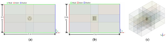 The domain size is equivalent to 20D × 11D × (10D + L), shown in Figure 2. This provides sufficient area for flow to develop before and after the turbine and reduces interference from outer boundaries. Similar domains have been used in literature, producing satisfactory results [13,20]. The geometry has been split into a stationary zone and rotating zone using a cylinder. The mesh has been further split up to assist in refining the mesh.