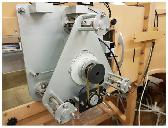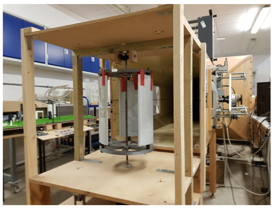 The model used for the VAWT experiments is of the same scale as the simulations. The model was constructed by previous researchers with a wooden frame and 3D-printed blades. The model was located at the end of the wind tunnel, as shown in Figure 6. The model has breaks attached to the top of the central shaft that could be applied by tightening nuts. The shaft was connected to a torque meter below the frame. Tape was attached to the blades to prevent them from rotating.