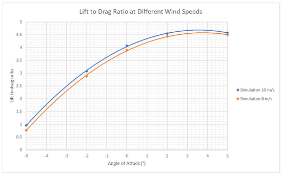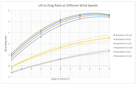 Figure 19 shows that the simulations have overestimated the values obtained from the experiment and that the experiments found a shallower curve. Additional simulations were performed at the same speeds as the experiments, displaying similar values and trends to the previous simulations. The experiments suggest that the optimal angle of attack would be above 5° instead of 4°, suggesting that more simulations are required above 5° to find the optimal angle. This is in line with the findings from Wright, Droubi, and Islam [30], where the optimal angle of attack is around 30°. However, the experiment shows the same basic trend of increasing the lift-to-drag ratio as the angle and wind speed are increased. On average the data from simulations predicted a twofold increase for 12 m/s and a fourfold increase for 6 m/s. This difference can be attributed to the surface roughness of the printed model, and the increased drag from the cylindrical rod that the aerofoil is mounted on. The difference could also suggest that the inlet and outlet conditions in the simulation are not representative of the wind tunnel, as increasing the turbulence would increase the lift and drag.