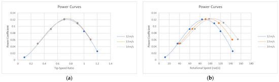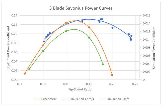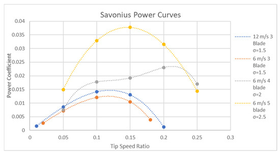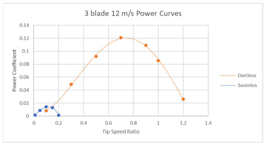 A comparison of the power curves for the three-blade Darrieus and Savonius designs at a wind speed of 12 m/s is shown in Figure 15. The Savonius power curve is small in comparison to the Darrieus power curve. However, the Savonius design achieved a higher coefficient of performance for the TSR range of 0.05 to 0.14 and will likely have similar or better performance below 0.05. This shows that the Savonius design is inefficient; however, it is a better choice than the Darrieus turbine for operation at low TSRs.
