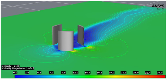 The wind speed data obtained from the experiments at roughly 14 m/s are shown in Table 6. This data was chosen for comparison as it was around a TSR of 0.1, allowing it to be compared with the contour in Figure 21. In the simulation of the sides of the turbine at 0.24 m, it is shown that the velocity is equal to or slightly higher than the inlet velocity. Meanwhile, the experiments found similar velocities directly to the side, which decreased downstream. The second set of experimental data showed an increase on one side, which could suggest the presence of turbulent flow. However, these discrepancies and the turbulent flow may not be a direct result of the turbine, instead being caused by the frame the model was mounted to and the lower surrounding wind speed. The simulation and experiments agree, with the downstream wake at the measured points having similar velocities that are gradually recovering.