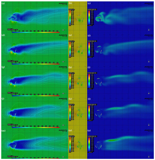 Figure 18 shows the contours obtained for the Savonius designs, at a TSR of 0.1 and wind speed of 6 m/s. The shape of the wake in the velocity and TKE contours is reminiscent of ocean waves, with the higher number of blades decreasing the wavelength but increasing the frequency (decreasing spacing between the waves). The velocity deficit stays at the minimum for a larger area and takes longer to recover in the five-blade design, due to the increased solidity from increasing the number of blades. In all cases, there is no large increase in velocity. The TKE increased as the blades increased, with the largest increase found near the blades. There is no significant change in the positive pressure in each case; however, the negative pressure and number of vertices does increase.