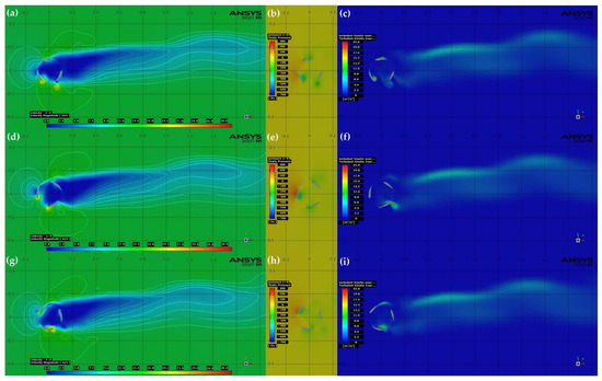 Contours at wind speed 14 m/s, rotational speed 98 rad/s for varied blade lengths/heights: (a) Velocity at 0.15 m; (b) Pressure at 0.15 m; (c) TKE at 0.15 m; (d) Velocity at 0.20 m; (e) Pressure at 0.20 m; (f) TKE at 0.20 m; (g) Velocity at 0.25 m; (h) Pressure at 0.25 m; (i) TKE at 0.25 m.