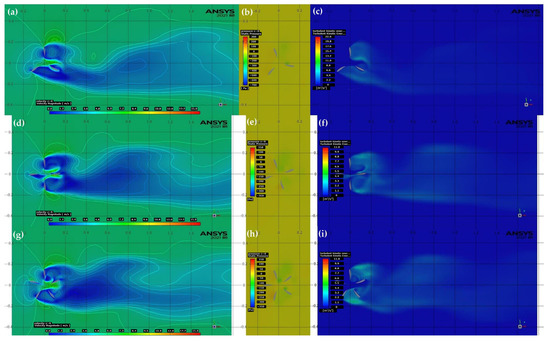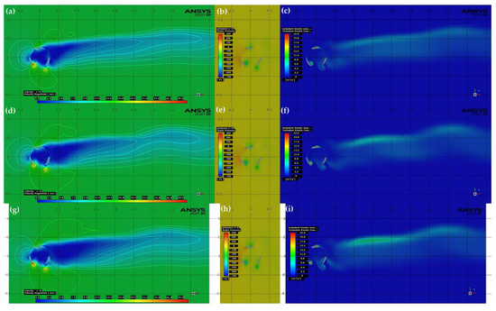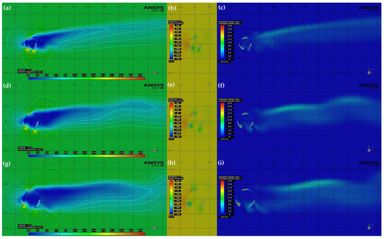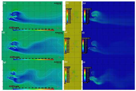 Contours at wind speed 6 m/s, TSR 0.1, for Savonius with varied number of blades: (a) Velocity with 3 blades; (b) Pressure with 3 blades; (c) TKE with 3 blades; (d) Velocity with 4 blades; (e) Pressure with 4 blades; (f) TKE with 4 blades; (g) Velocity with 5 blades; (h) Pressure with 5 blades; (i) TKE with 5 blades.