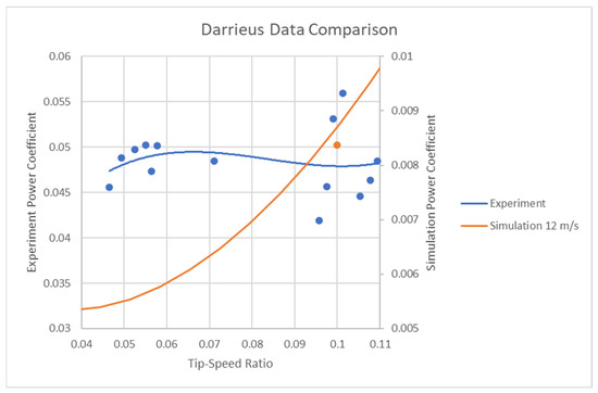 The data obtained from the experiments are compared with a simulation in Figure 20. At low TSRs, the simulation shows a trend of increasing power coefficient with TSR that is not shown in the experiment, with the average staying around 0.048. The experiment obtained a power coefficient five times higher than the simulation at the highest TSR and almost fifteen times higher at the lowest TSR. To declutter experimental data, the TSRs with less than 5 data points were excluded, the average at each TSR was obtained, then similar TSRs were averaged. The different trends could be related to the frame of the experiment model, and the walls of the wind tunnel. Additionally, for the experiment, the inlet has a smaller area, and the air around the turbine is stagnant, while the simulation has a flow of 12 m/s fully surrounding the turbine. The discrepancies could also be a problem of the simulation struggling to model low TSRs. Additionally, the turbulent conditions set for the inlet and outlet of the simulation may differ from the experiment. A similar underprediction by the simulations was observed by Durkacz et al. [6] when using a similarly designed turbine.