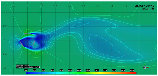 Velocity streamlines at wind speed 14 m/s and TSR of 0.1.