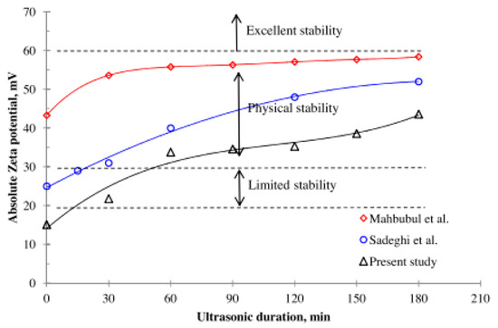 | 2016 | Al2O3 (20, 80, and 100 nm)/glycerol | 1–5 vol % | Property | - | 6 h (20–30 nm and 3 h (80 and 100 nm) @ 75% amplitude with 0.8 s (pulse active) and 2 s (pulse idle) | NU | Hielscher ultrasonic processor (UP200S, 200 W, 24 kHz) | Adio et al. [72] | ZP |