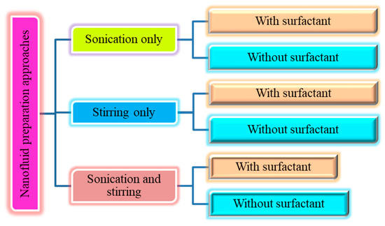 - Preparation of nanofluids involved cases of (i) sonication with and without surfactants, (ii) stirring and sonication with and without surfactants, and (iii) stirring with and without surfactants.