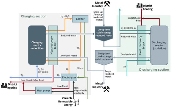 Schematic of the TCES plant proposed in this work, based on a high-temperature redox cycle. The plant absorbs VRE to produce hydrogen in the electrolyzer together with nondispatchable heat for the DH network. The hydrogen is then used to reduce a metal in a charging reactor. From there, the metal is transferred to a storage unit, from which the metal is subsequently transported to a discharging reactor, where it is oxidized to produce dispatchable heat for the DH network. A make-up stream of reduced metal is included, as is the purged oxidized material, which can be sent back to a local metal industry.