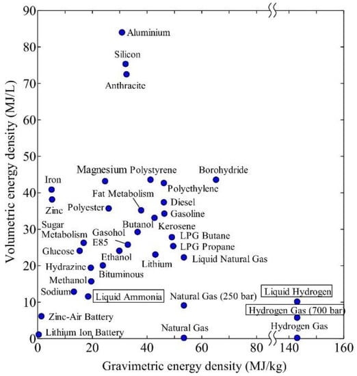 Gravimetric and volumetric energy densities of metals compared with organic combustible materials and batteries. Source: Kobayashi et al. [55].