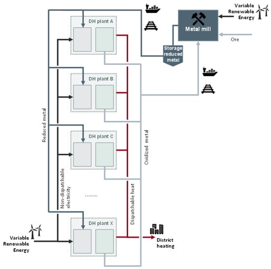 In the present work, Sweden is selected as an illustrative case to carry out an initial assessment of the proposed scheme. As explained in Section 1, Sweden has strong potential to implement such a system thanks to its existing metal ore mining activity and infrastructure for metal reduction, the ongoing expansion of VRE electricity, and widespread DH systems.