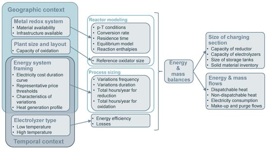 The present work comprises a quantitative assessment of the proposed scheme by using exclusively energy and mass balances at the plant level. An overview of the assessment methodology is presented in Figure 5, where the inputs and outputs for the calculation of the energy and mass balances are indicated. By selecting certain geographic and temporal contexts, the input parameters can be defined, i.e., the redox system, the representative plant size, the electrolyzer type, and the surrounding energy system. The latter will define the availability and variability of electricity at a certain price profile, a share of which can be used and stored within the system. Note that the process is based on the retrofitting of existing units, as does the methodology presented in Figure 5.