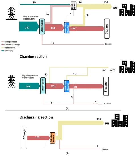 Figure 7 shows the overall energy balances of the proposed scheme for both of the charging and discharging sections, normalized for 100 energy units of dispatchable heat production, for the processes with low- and high-temperature electrolyzers. A look at the charging section shows that despite the fact that a large share of the heat losses from the electrolyzers is recovered by the heat pump, unrecoverable losses persist and make up the largest fraction of the losses in the system. It is also clear that the reduction reactor suffers no heat losses, thanks to the placement of the heat pump, while the oxidation reactor has an 8% inherent loss of heat because no heat pump is assumed available when running the discharging section (although this aspect could be considered in further analyses, it would be subject to the availability of competitive electricity). Regarding the case in which high-temperature electrolyzers are used for the retrofit (Figure 7b), the fraction of the heat losses slightly increases compared with the process with low-temperature electrolyzers, owing to the absence of the heat pump, whereas the level of electricity consumption is substantially decreased.